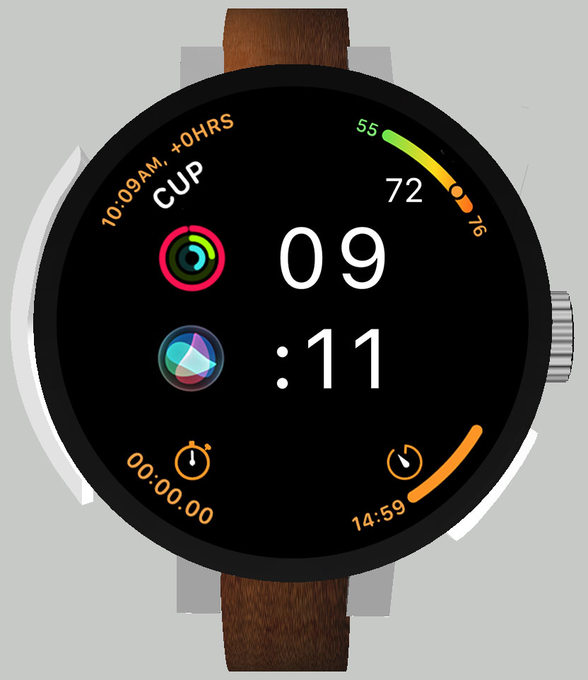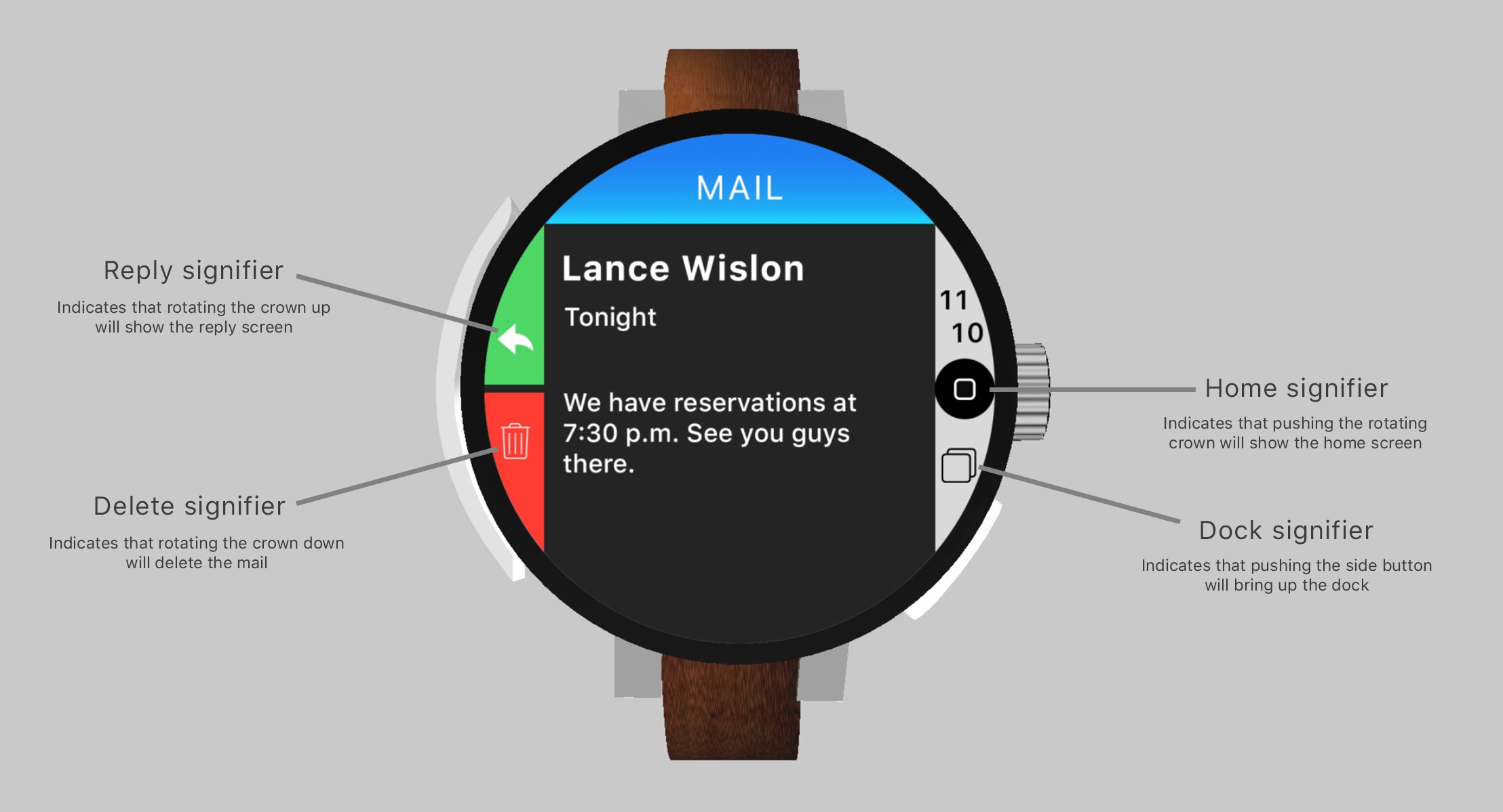 The notification screen takes full advantage of the watch round shape. Controls appear on each side. The left side indicates what happen when you rotate the crown up or down. The right side indicates that pushing the Digital Crown